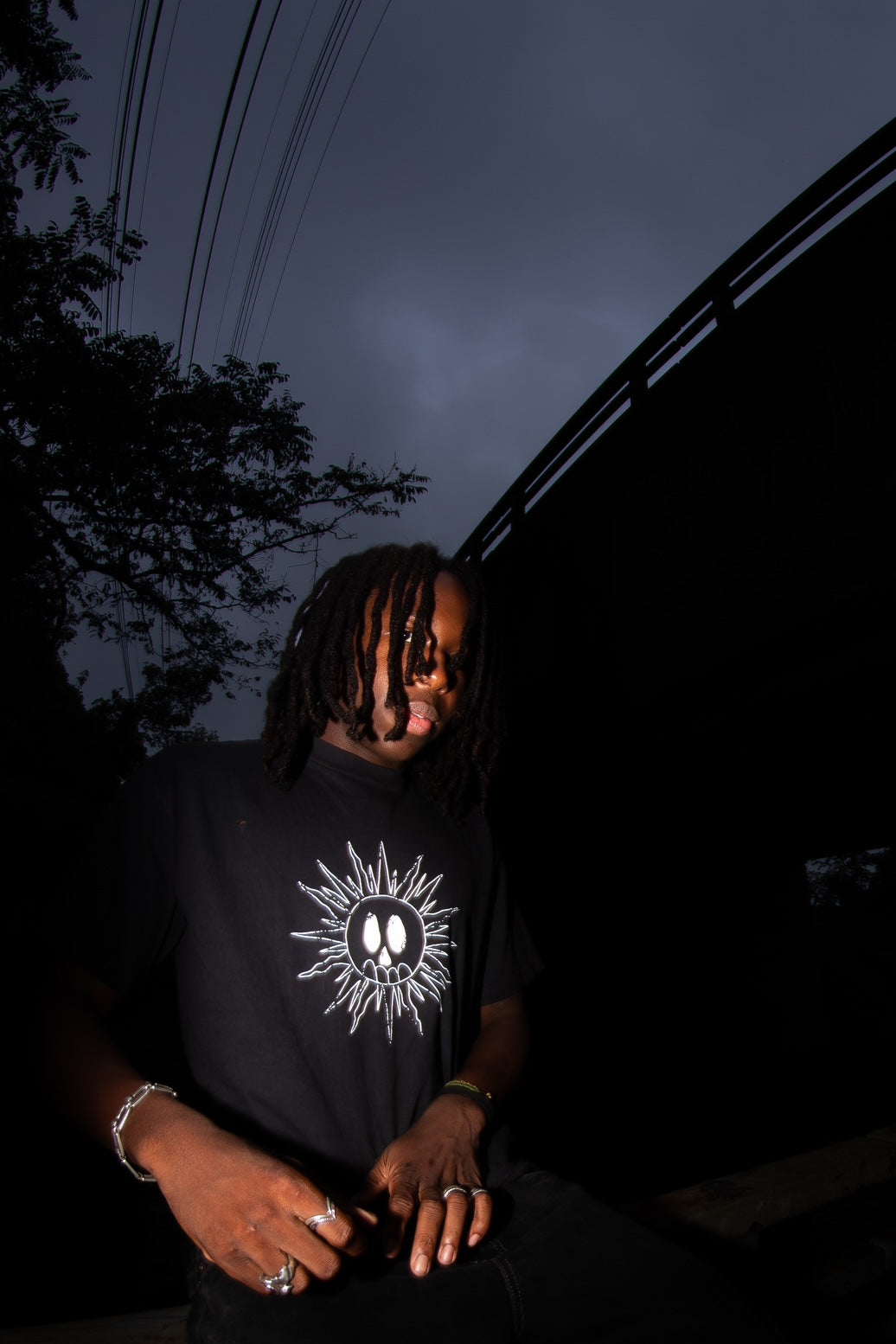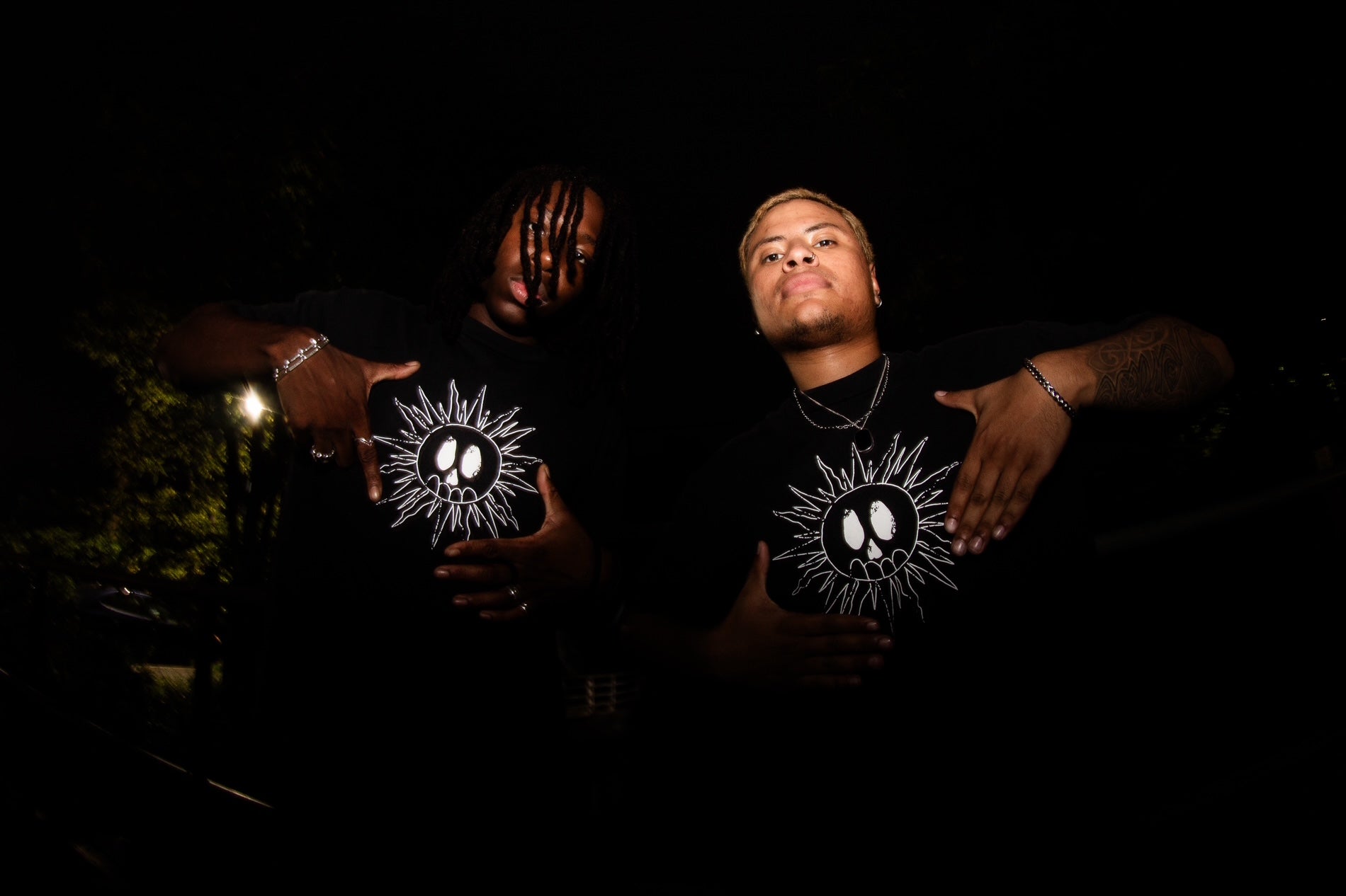 Distressed design printed on a heavyweight 8.5 black shirt, with distressing done by hand. Every shirt is distressed in different places so each one is unique! Models are wearing a size medium.